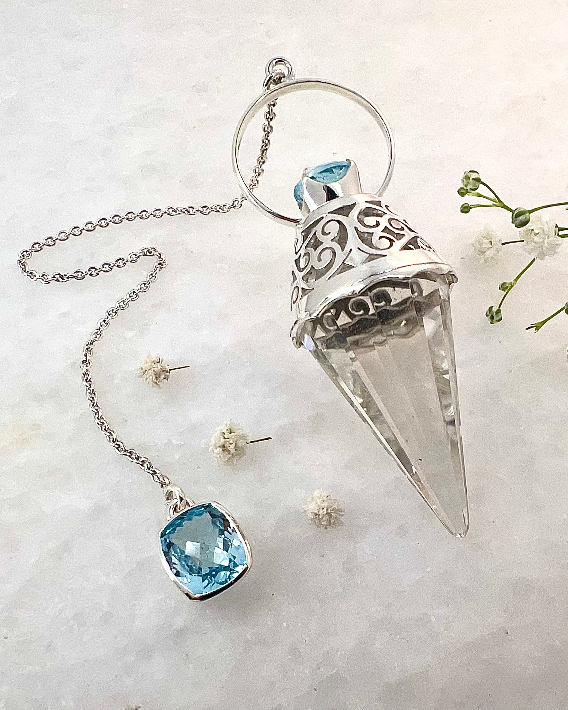 Vogel Cut Crystal Point with Facetted Blue Topazes in Fancy .925 Silver Setting with Cutwork Design as a Pendulum