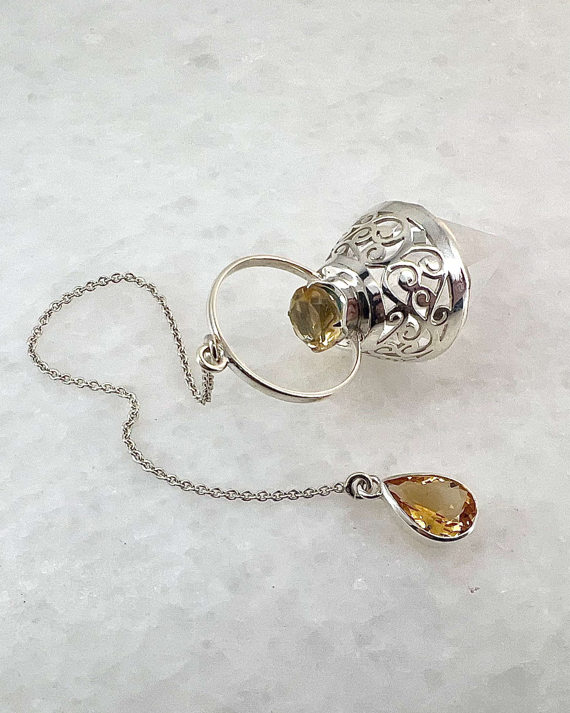 Vogel Cut Crystal Point with Facetted Citrines in Fancy .925 Silver Setting with Cutwork Design as a Pendulum